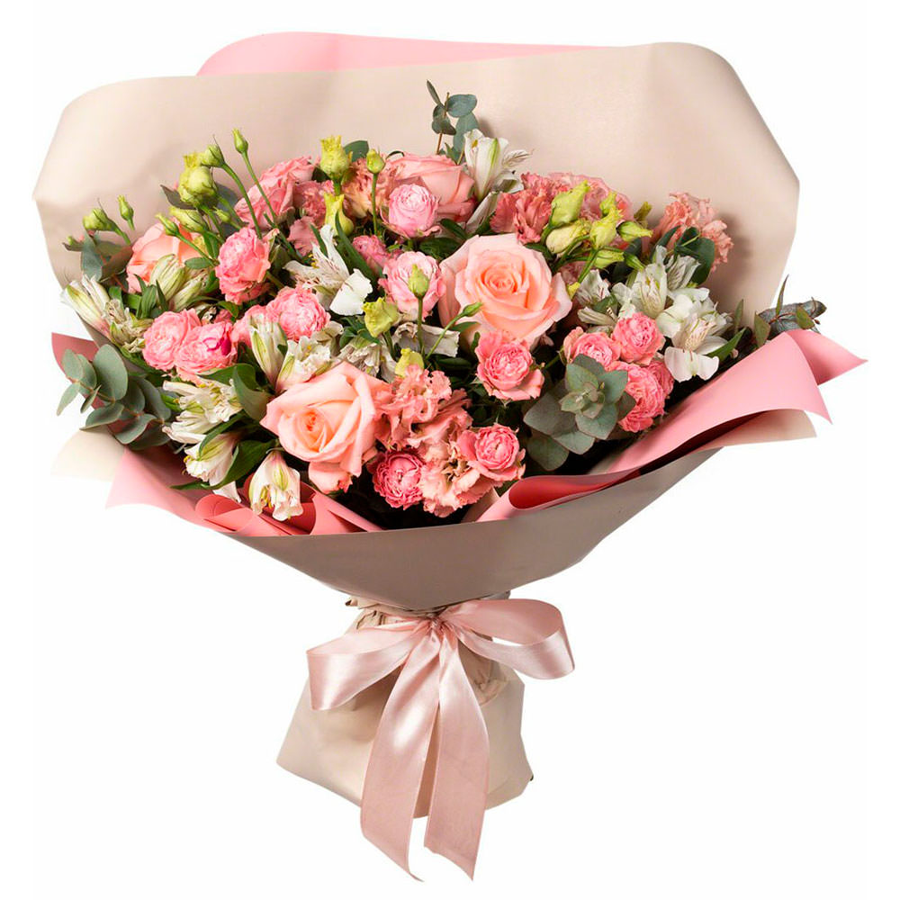 Роза одноголовая, роза кустовая, альстромерия, эвкалипат.